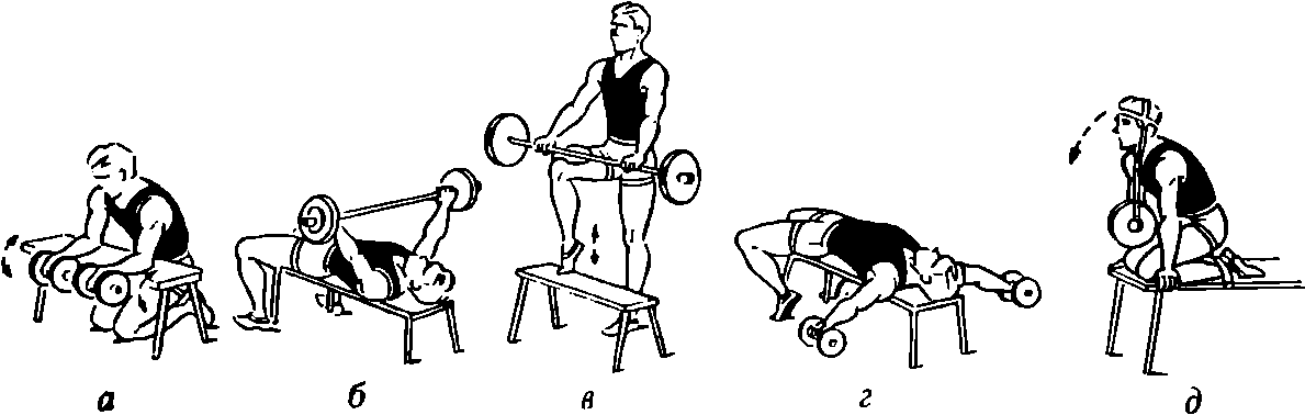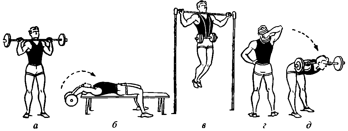1. Для мышц плечевого пояса и разгибателей предплечья. Жим штанги. Описание упражнения дано в первом уроке, но здесь штангу выжимают только от груди и хват на ширине плеч (рис. 10, а).