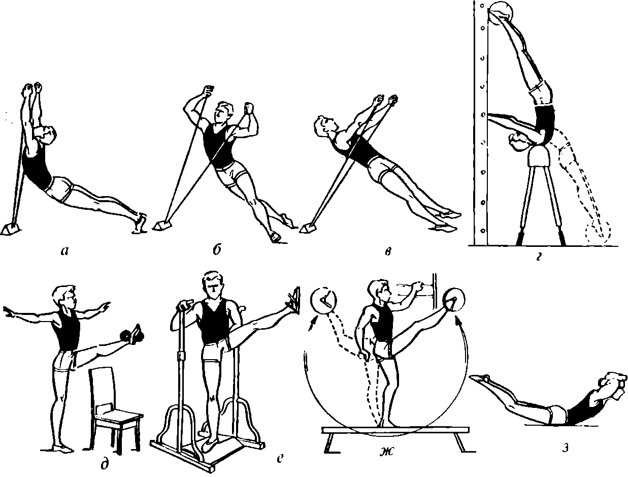 Махи в сторону (рис. 24, е) и махи вперед-вверх и назад-вверх (рис. 24, ж) выполняются либо без отягощения, либо с небольшим отягощением, прикрепленным к стопе, стоя одной ногой на возвышении, взявшись одноименной рукой за упор, по нескольку раз в подход со сменой ног.