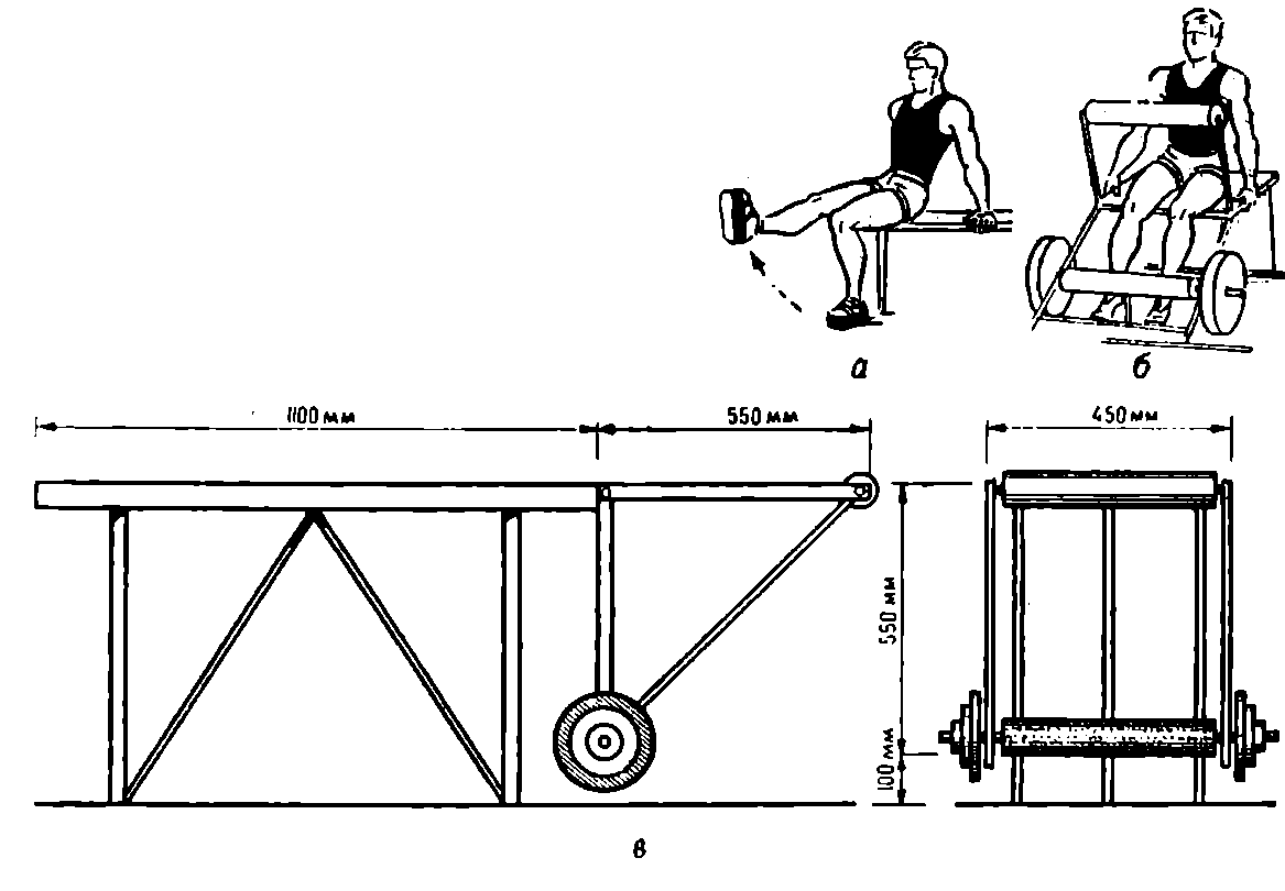 Разгибание голени с отягощениями, прикрепленными к стопе, можно выполнять сидя, при этом значительно снижается нагрузка на позвоночник (рис. 28, а). Наиболее удобен в этом отношении силовой тренажер, показанный на рис. 28, б, в.