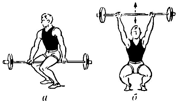 Приседание, держа штангу на прямых руках, поднятых вверх (рис. 29, б), требует хорошей координации работы мышц спины, груди, плечевого пояса, рук.