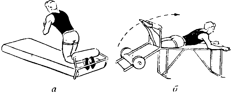 Как видите, тренировать силу мышц задней поверхности бедра с помощью штанги и гантелей не просто. Можно избежать этих трудностей, если воспользоваться силовым тренажером, показанным на рис. 32, б. На таком станке можно выполнять также упражнения для мышц рук и спины.