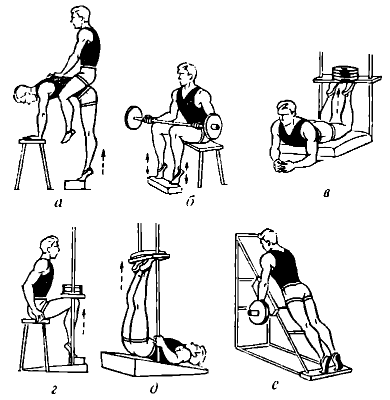 Подъем на носки можно выполнять и сидя. В этом случае штанга лежит на коленях (рис. 33, б) или на станке для жима ногами в положении лежа на животе; вес опускается и поднимается только движением голеностопных суставов (рис. 33, в).