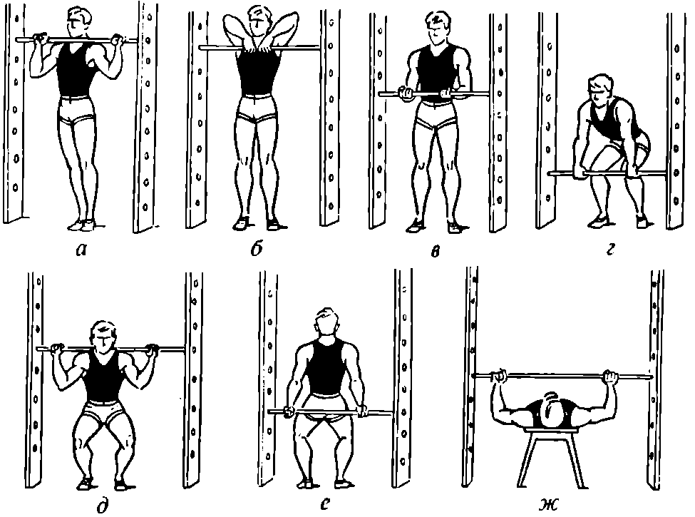 6. И. п. – гриф закреплен в положении, при котором передняя поверхность бедра параллельна полу, старайтесь как бы подняться из приседа с грифом на плечах (рис. 35, д).