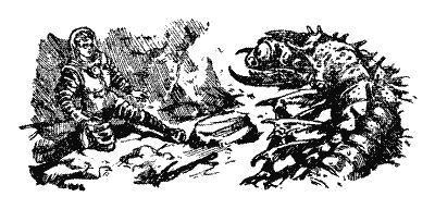 Странное, нелепое, отвратительное существо подползало к нему. Геолог невольно отшатнулся к каменной глыбе, высившейся за ним. На него глядели холодные, прозрачные глаза, будто вдавленные в коричневый панцырь головы. С обеих ее сторон, медленно изгибаясь в воздухе, двигались длинные желтые щупальцы. Огромные, расположенные горизонтально челюсти были похожи на кривые острые сабли; они раздвигались все шире и шире, готовые схватить и рассечь пополам свою добычу.