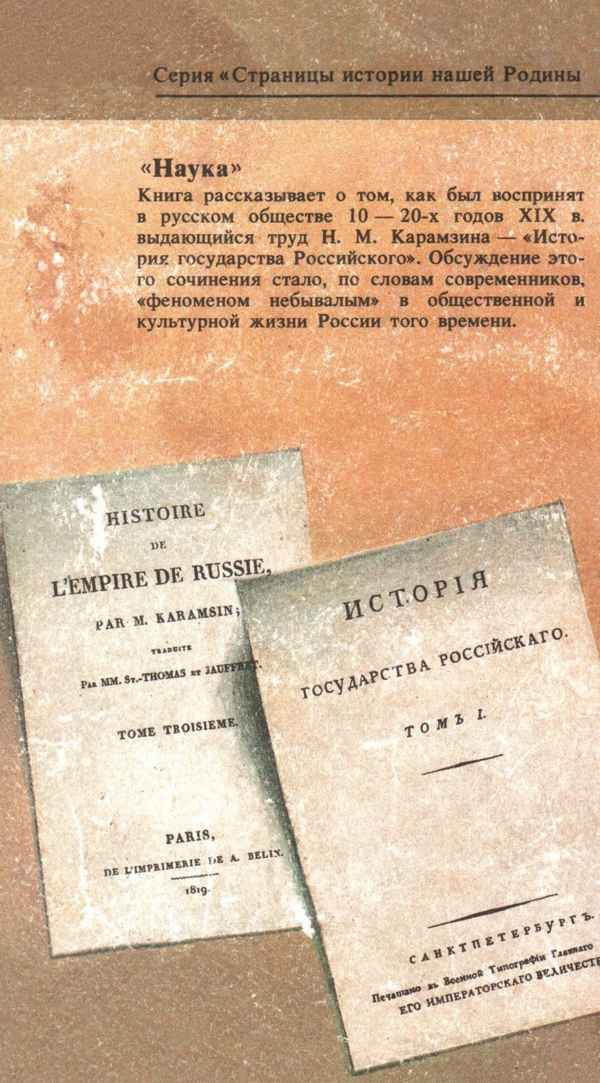Книга рассказывает о том, как был воспринят в русском обществе 10—20-х годов XIX в. выдающийся труд Н. М. Карамзина – «История государства Российского». Обсуждение этого сочинения стало, по словам современников, «феноменом небывалым» в общественной и культурной жизни России того времени.