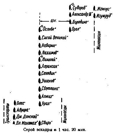 В 11 час. 40 мин. правая колонна заняла головное положение и легла на прежний курс. 1-е отделение миноносцев и крейсера «Жемчуг» и «Изумруд» перешли на правый фланг, держась на траверзе 1-го броненосного отряда. 2-е отделение миноносцев отошло к хвосту колонны, а крейсера с транспортами несколько отделились от главных сил и держались в тылу.