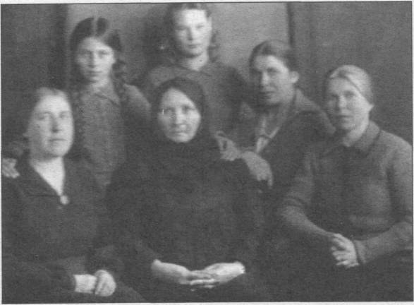 Анна Трифовна Двигова /в центре/. Слева направо /сидят/: Капитолина, Рахиль и Антонина Рябовы; стоят: Вера и Мария – сиротки, ходили к Двиговым обедать, Двиговы их «обували и одевали, и советовали»