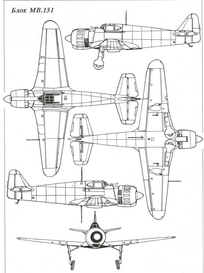 Семейство истребителей "Блок" появилось в 1935 г., когда Морис Руссель начал разработку цельнометаллического моноплана с низкорасположенным свободнонесущим крылом. Постройка его началась в сентябре на заводе фирмы "Авьонс Марсель Блок" в Курбевуа как частная программа. Проектирование и постройка прототипа, MB. 150, финансировались исключительно за счет фирмы. Сейчас является предметом обсуждения, насколько истребитель Рус– селя соответствовал спецификации на новый одноместный истребитель, опубликованной в сентябре предыдущего года Технической службой авиации, но не может быть больших сомнений в том, что он соответствовал основным принципам. Собранный в июле 1936 г. в Виллакублэ, куда прототип был перевезен для окончательной сборки и испытаний, MB. 150 имел двухлонжерон– ное крыло, состоящее из четырех частей, которое присоединялось на болтах к фюзеляжу, выполненному в виде одного узла, вдоль центральной линии. Короб в каждой внешней части крыла вмещал топливный бак и объем для размещения колес и стоек шасси, причем последнее выглядело чрезвычайно необычным для истребителя, так как очень короткие стойки шасси создавали малый стояночный угол и линия колес находилась под центром тяжести самолета, так что на хвостовое колесо приходился лишь некий номинальный вес.