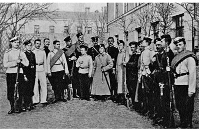 Наконец сигнал был дан, и бараки закипели лихорадочной жизнью: юнкера быстро вскакивали, поспешно надевали заранее приготовленные и тщательно каждым продуманные костюмы и быстро строились перед бараками своих рот. Фантазии и изобретательности каждого юнкера предоставлялось придумать себе соответствующий событию костюм, причем приходилось, конечно, удовлетворяться тем, что было под рукой; некоторые воспользовались своим штатским платьем, в котором они прибыли в училище, другие обратились за помощью к нашим ротным каптенармусам, снабдившим их мундирами мирного времени и киверами. Большинство было в одних кальсонах, в мундирах и киверах, некоторые – в шляпах, кепках и штатских фуражках, в студенческих тужурках или пиджаках, одним словом – в различных комбинациях штатского с военным; были в бескозырках задом наперед, но все без исключения без штанов; винтовки несли на правом плече и прикладом вверх.