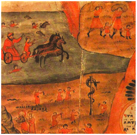 Переход через Чермное море. Фрагмент рисованного лубка на сюжеты библейской книги «Исход». XIX в.