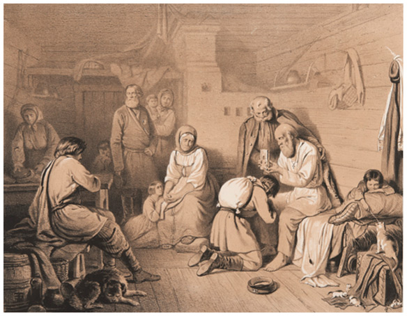 Крестьянские посиделки на Руси. Гравюра Кристиана Гейслера. XVIII в.