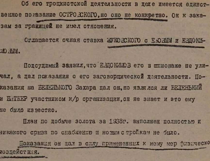 «Первоначально Жуковский показал, что в качестве агента немецкой разведки он был завербован при содействии работника торгового представительства СССР в Германии Биткер, однако позже, после ареста Ежова Н.И., Жуковский стал утверждать, что для работы в пользу немецкой разведки он был привлечен Ежовым».