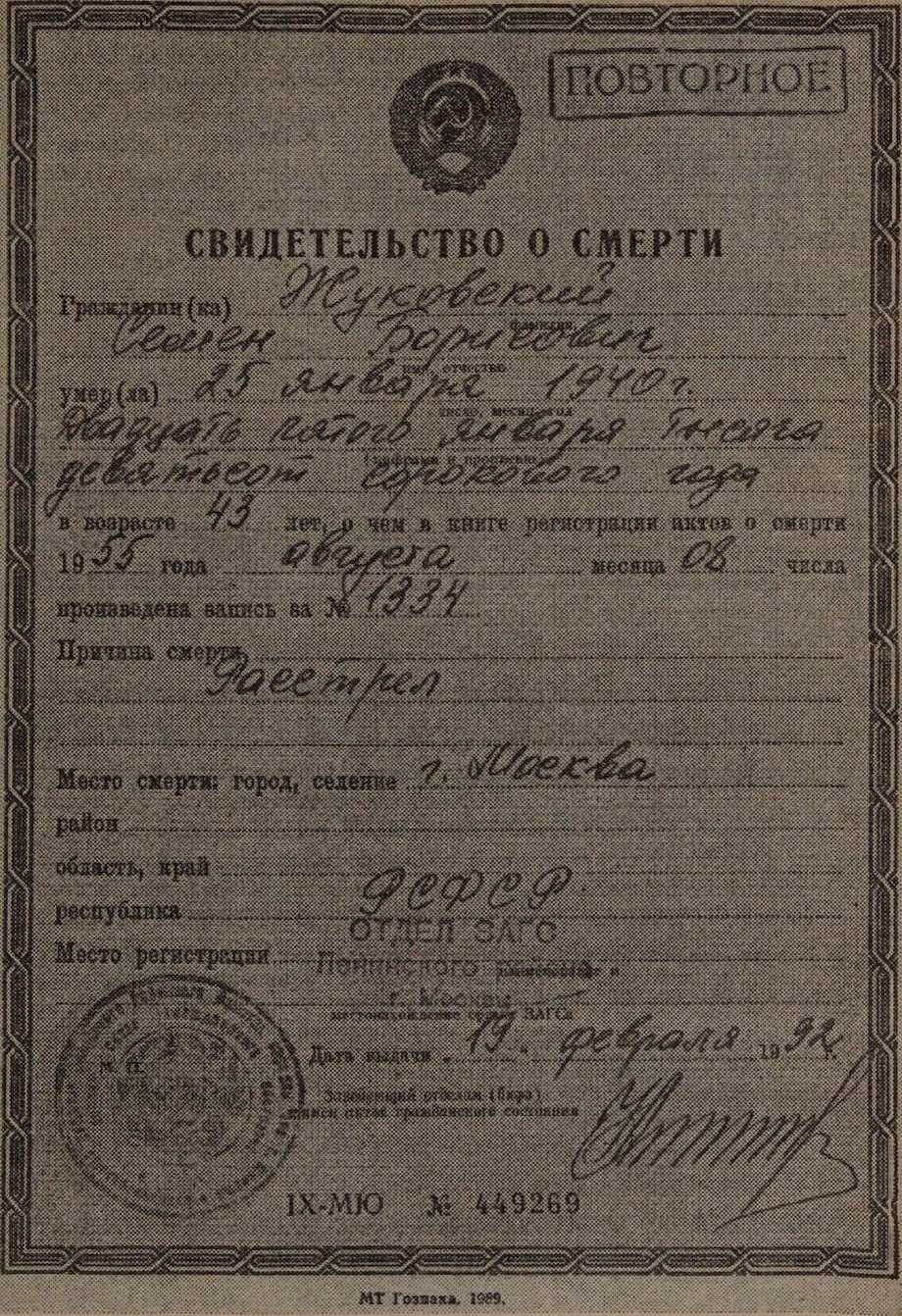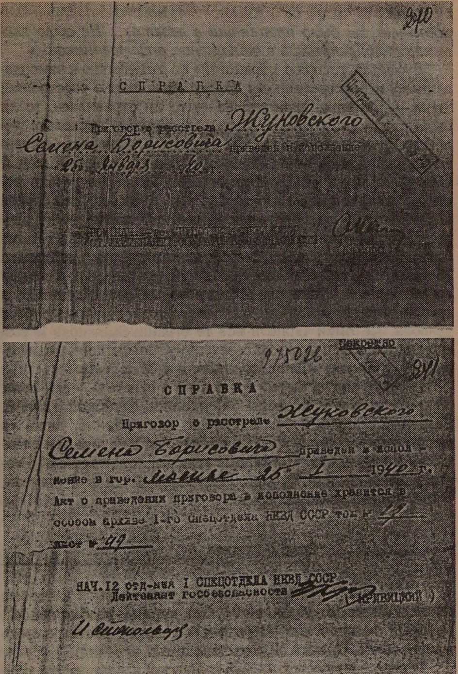 «Следственное дело на Жуковского С.Б. было зарегистрировано в 1-ом спецотделе НКВД СССР за бывшим пом. нач. след, части НКВД тов. ШКУРИНЫМ, который являлся ответственным лицом за дело ЖУКОВСКОГО и непосредственным следователем Жуковского С.Б.