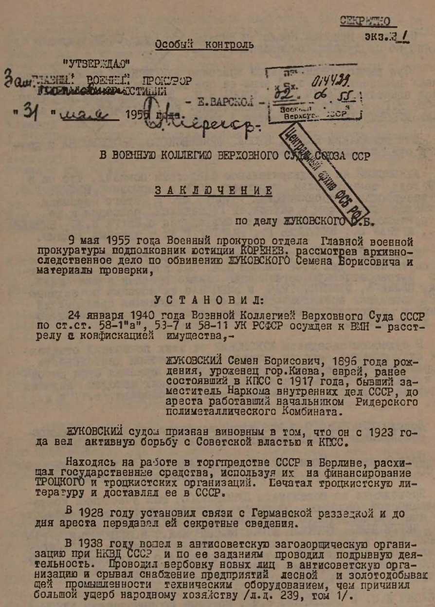 «В связи с проверкой материалов архивно-следственного дела на ЖУКОВСКОГО Семена Борисовича, 1896 г. р., ур. г. Киева, работавшего в 1927–1934 г.г. в Торгпредстве СССР в Берлине, просим проверить имеются ли какие-либо данные о его принадлежности к германской разведке.