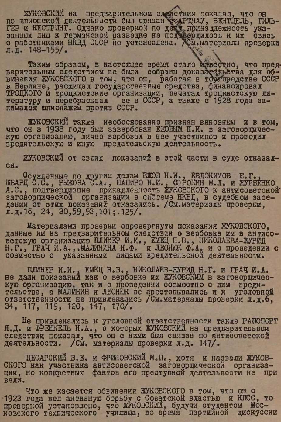 «Таким образом, в настоящее время стало известно, что предварительным следствием не были собраны доказательства для обвинения Жуковского в том, что он, работая в торгпредстве СССР в Берлине, расхищал государственные средства, финансировал Троцкого и троцкистские организации, печатал троцкистскую литературу и перебрасывал ее в СССР, а также с 1928 года занимался шпионажем против СССР.