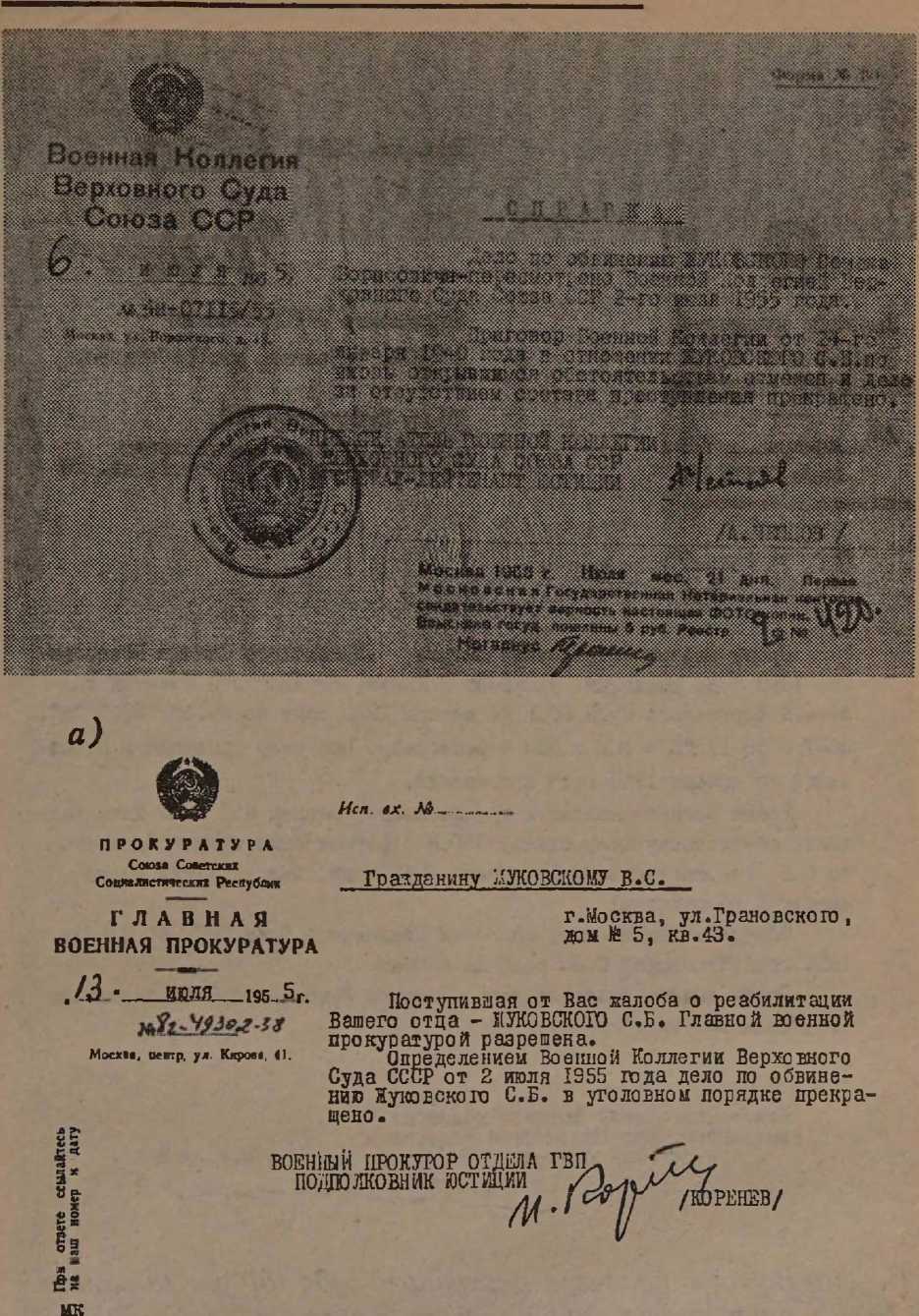 9 мая 1955 г. подполковник юстиции Коренев, прокурор Главной военной прокуратуры, поставил точку в своем подробном «Заключении по делу Жуковского С.Б.», адресованном Военной Коллегии Верховного суда СССР. Коллегия под председательством полковника юстиции Коваленко спустя два месяца определила: приговор пятнадцатилетней давности отменить и дело за отсутствием состава преступления прекратить. Основанием послужило упомянутое «Заключение», которое практически коллегией и воспроизведено. Написанное бесстрастным стилем, Заключение от этого только выигрывает в своей убедительности.