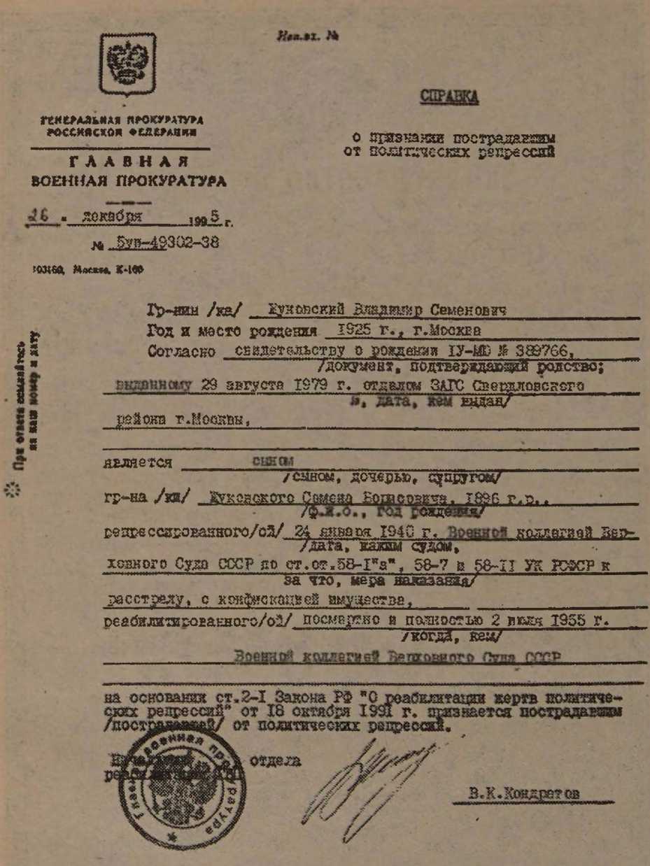 Реверс закрутился в 1955 г. Реагируя на мою жалобу, Главная Военная Прокуратура знакомится с делом отца и находит там ряд существенных изъянов и несообразностей. В результате появляется письмо зам. Главного Военного Прокурора Д. Китаева зам. председателя КГБ Луневу А.Ф.: «Направляю жалобу гражданина Жуковского В.С. (мое «прошение» Ворошилову. – В.Ж.) и дело по обвинению бывшего заместителя Наркома Внутренних дел СССР Жуковского Семена Борисовича, осужденного в 1940 г. к ВМН». Перечисляются явные «проколы», в частности: арест без санкции прокурора; отказ отца в суде от первоначальных показаний. Затем, Жуковский «неоднократно отказывался от первоначальных показаний, однако ни одного протокола допроса Жуковского с отказом от ранее данных показаний в деле не имеется».