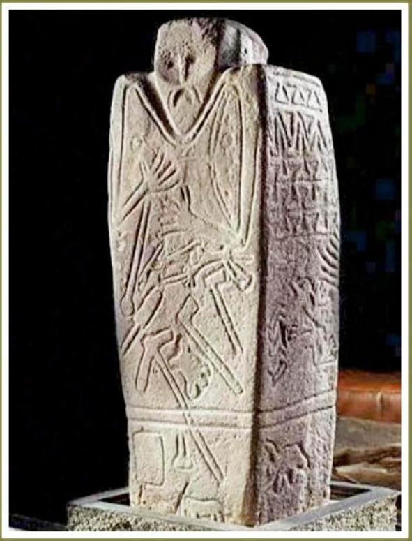 По всей видимости, как мне подсказали сведущие люди, это – запечатленное в камне изображение протоарийского божества – создателя мира, подателя жизни и благополучия. Обозначен лик божества, строгий и аскетичный, показаны поднятые вверх руки с атрибутами верховной власти. На гранях стелы, в отдельных рисунках и целых композициях изображены, по всей вероятности, сцены из мифов, посвященные временам сотворения и освоения мира.