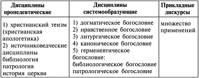 Учебное обоснование предложенной классификации. Дисциплины пропедевтические как, пользуясь выражениями митр. Макария, лишь «предварительно богословские», но необходимые для изучения системообразующих. «Амбивалентный» характер дисциплин прикладных, включающих разнородные направления теоретической и практической рефлексии, «подготовляемые» в изучении системообразующих. Основополагающая дисциплина – догматическое богословие, имеющее определяющее значение для всех остальных системообразующих и отчасти в них «развиваемое», «предваряемое» в пропедевтических дисциплинах (поскольку они изучаются под углом зрения христианского дискурса) и «применяемое» в прикладных.