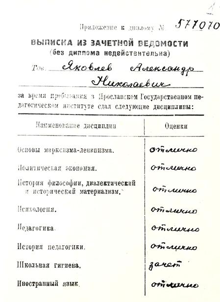 Выписка из зачетной ведомости А. Н. Яковлева. 18 апреля 1947. [ГА РФ]