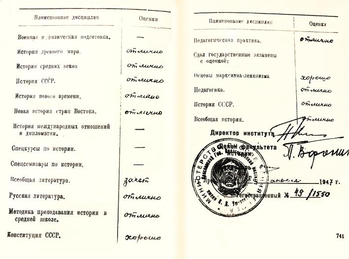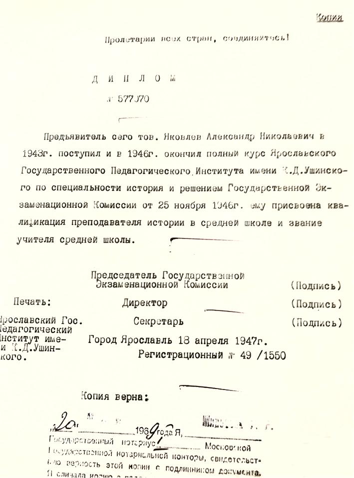 Диплом А. Н. Яковлева об окончании Ярославского государственного педагогического института им. К. Д. Ушинского. 18 апреля 1947. [ГА РФ]