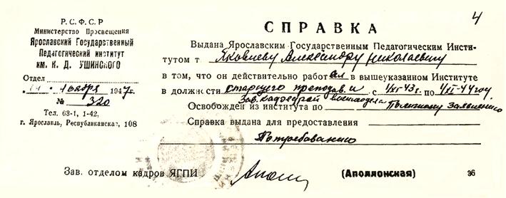 Справка о работе А. Н. Яковлева старшим преподавателем в Ярославском государственном педагогическом институте. 14 ноября 1947. [Из личного архива А. Н. Яковлева]