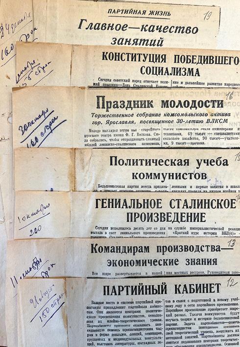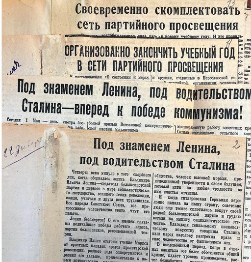 «Под знаменем Ленина, под водительством Сталина», «Организованно закончить учебный год в сети политпросвещения», «Политическая учеба коммунистов», «Гениальное сталинское произведение», «Командирам производства – экономические знания», «Партийный кабинет», «Выше качество лекционной пропаганды», «Выше уровень партийной учебы». И так далее, и тому подобное…