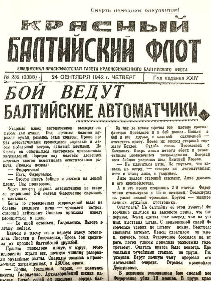 Статья из газеты «Красный Балтийский флот», которая рассказывает о боевой службе морпеха А. Яковлева. 24 сентября 1942. [Из открытых источников]