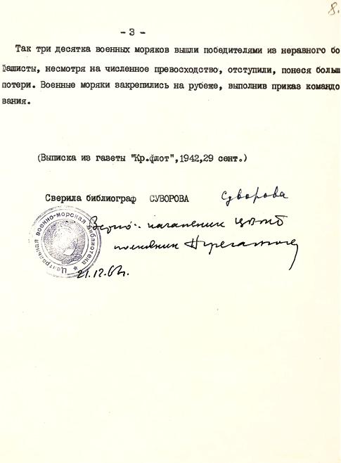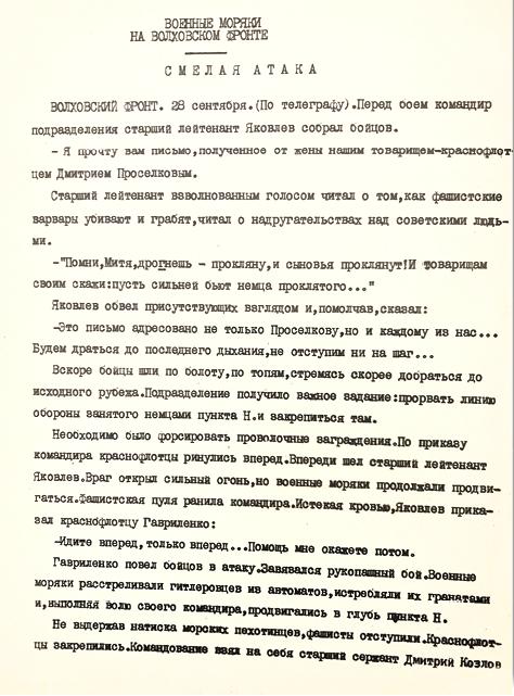 Статья «Военные моряки на Волховском фронте. Смелая атака», опубликованная в газете «Красный флот». 29 сентября 1942. [Из открытых источников]