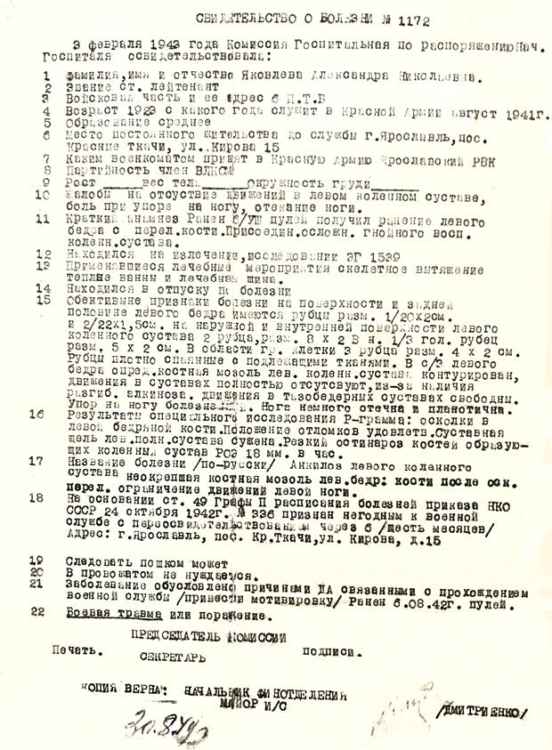 Свидетельство о болезни А. Н. Яковлева. Не ранее 3 февраля 1943. [Из личного архива А. Н. Яковлева]