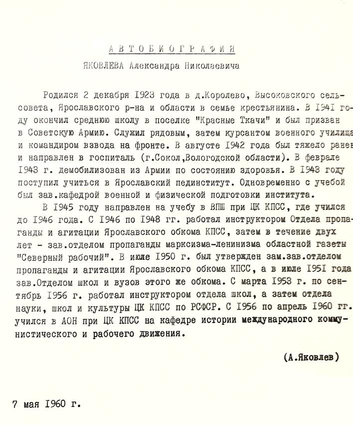 Автобиография А. Н. Яковлева. 7 мая 1960. [Личный архив А. Н. Яковлева]