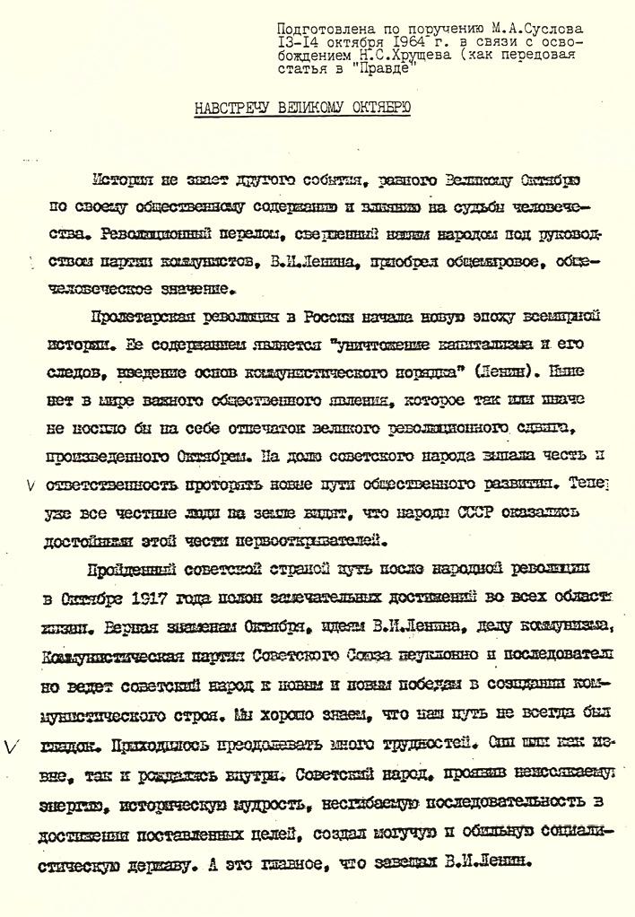 Статья А. Н. Яковлева «Навстречу Великому Октябрю», подготовленная в связи с освобождением Н. С. Хрущева от должности секретаря КПСС. [ГА РФ. Ф. 10063. Оп. 1. Д. 60]