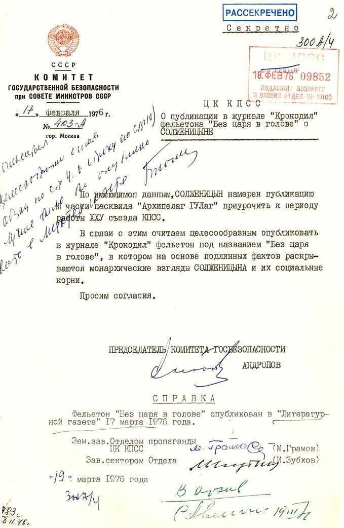Записка Ю. В. Андропова в ЦК КПСС о публикации фельетона «Без царя в голове» о А. И. Солженицыне. 17 февраля 1976. [РГАНИ. Ф. 5. Оп. 69. Д. 2897. Л. 2]