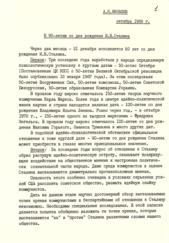 Обеспокоенный возможным раздраем внутри партии по вопросу о Сталине и сталинизме, Яковлев в своей записке предлагает целый ряд идеологических мер, призванных сгладить остроту проблемы.