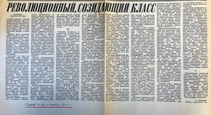 Статья и. о. заведующего Отделом пропаганды ЦК КПСС А. Н. Яковлева, опубликованная в «Правде». 22 декабря 1971. [Из открытых источников]