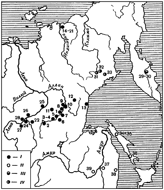 1 – Белькачи I; 2 – Усть-Тимптон; 3–4 – Сумнагин I, II; 5 – Тимулур; 6 – Алысардах; 7 – Дюктайская пещера; 8 – Билир; 9 – Усть-Миль; 10 – Верхне-Троицкая; 11 – Буяга; 12 – Якимджа II; 13 – Амка; 14–21 – Пантелеиха I–VIII; 22 – Большая Северная; 23 – Усть-Чиркуо; 24 – Тёрют I; 25 – Куллаты; 26 – Ат-Дабан; 27 – Точильная; 26 – Нюя; 29–30 – Ушковские стоянки; 31 – Сибердиковская; 32 – Конго; 33 – Малтан; 34, 35 – Имчин I–II; 36 – Такое II; 37 – Осиповка; 38 – Устиновка; 39 – Олений I.
