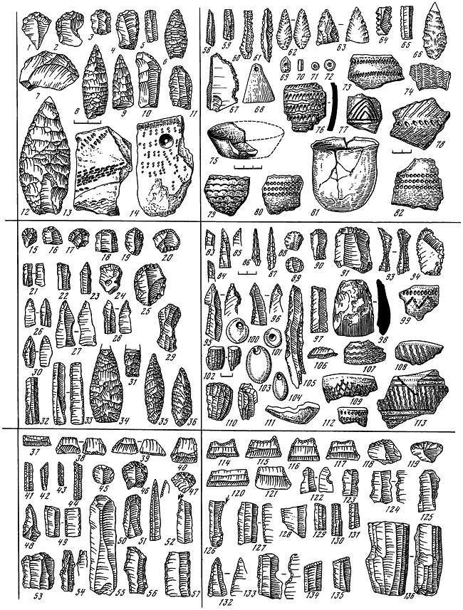 Специфика так называемой нижнеузбойской культуры бесспорна. Показательны находки фрагментов кругло донного окрашенного сосуда типа Анау II и толстостенного сосуда типа четвертого слоя Джебела – с примесью раковин в тесте, следами грубого заглаживания поверхности пучками травы и с поперечными насечками по венчику (Толстов, 1962). Для индустрии типична пластинчатая техника с микролитоидными элементами. Из орудий известны наконечники стрел с двусторонней обработкой, концевые скребки, вкладыши с притупленным краем, выемчатые изделия, скребки на отщепах, единичны сверла, проколки, треугольные остроконечники и т. п. (рис. 40, 20–73).