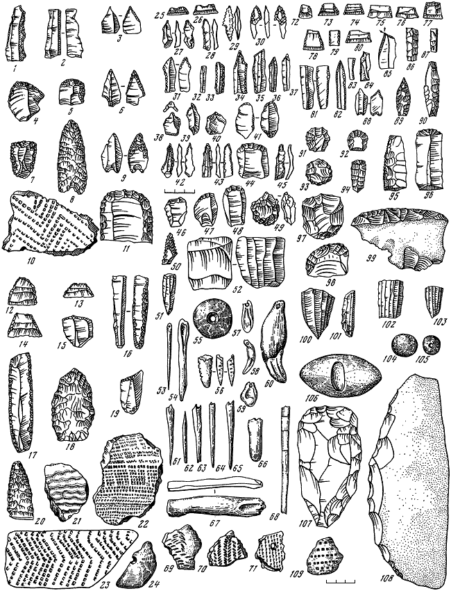 Преобладающий тип изделий на стоянках – орудия из пластины длиною 3–5 см, шириной – 0,5–1,2 см, концевые скребки, лезвия с заостренным ретушью рабочим краем, пластинки с притупленной спинкой, косые острия, реже – резцы и наконечники стрел. Среди последних встречаются короткие, с усеченным основанием и длинные асимметричные – кельтеминарского типа. Их дали стоянки Саксаульская (Формозов, 1959б), Шулкум (Виноградов, Кузьмина, Смирин, 1973) в Приаралье, Ак-Кум на Сагизе и Кок-Тубек на Эмбе (Формозов, 1950а; 1951). Большинство наконечников имеет двустороннюю обработку и выемку в основании. На стоянке Агиспе в Северном Приаралье есть серия трапеций (Формозов, 1949). Единичные трапеции найдены в Саксаульской и Шулкуме. Нуклеусы в основном конические с односторонней и – реже двусторонней или круговой обработкой.
