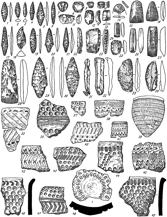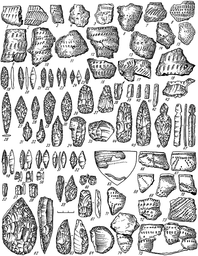 Рис. 61. Валдайская культура. Керамика и кремневые изделия раннего (48–75) и среднего (1-47) этапов.