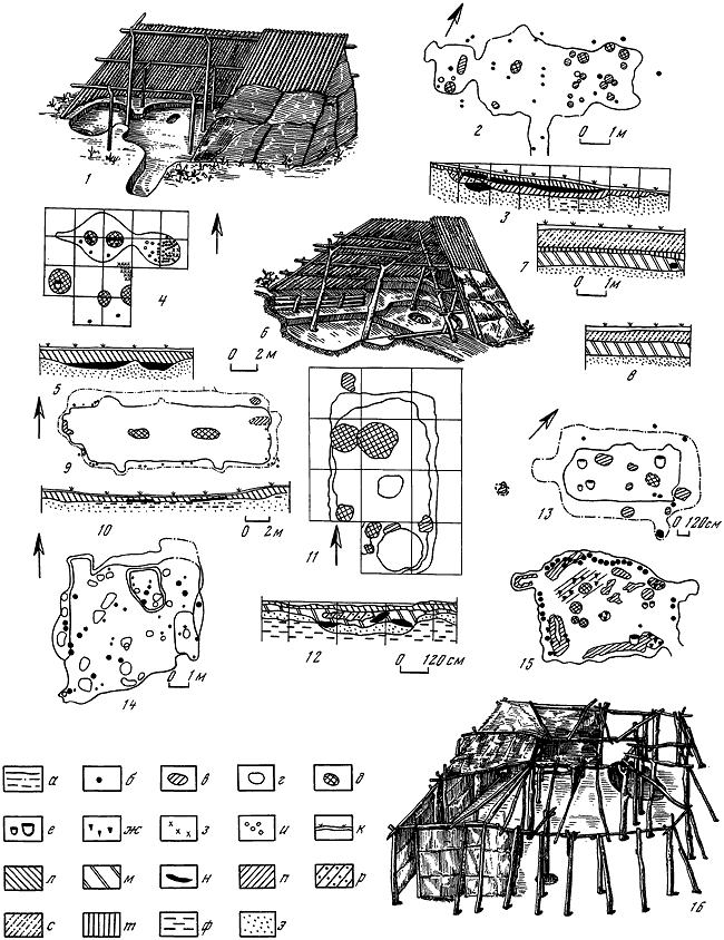 а – контуры жилищ; б – ямки от столбов; в – ямы хозяйственные; г – ямы неясного назначения; д – темные (зольные) пятна; е – сосуды; ж – угли; з – кремневые изделия; и – кости; к – дерн; л – культурный слой (желто-серый песок); м – культурный слой (средняя часть); н – прокал; п – желтая супесь; р – темно-серая супесь; с – гумусированный песок (черная супесь); т – погребенная почва; ф – глина; э – песок (материковый).