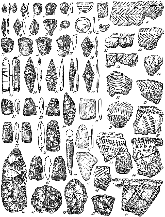 На Валдайской возвышенности известны мезолитические и ранненеолитические памятники с чистыми комплексами и выявлены различия между средним и поздним неолитом. Устойчивые серии орудий и керамики позволили выделить неолитическую валдайскую культуру (Гурина, 1958). На западе она граничила с культурами Восточной Прибалтики (с нарвской и позднее с прибалтийской). Западная граница доходила до р. Ловать (во всяком случае исключительно до верховьев Западной Двины и оз. Охват), на севере распространялась до Новгородской области, занятой в раннем неолите нарвской, в среднем и позднем – прибалтийской культурой. На востоке валдайская культура занимала Верхнее Поволжье до г. Тверь, на юге простиралась до верховьев Днепра[33]33