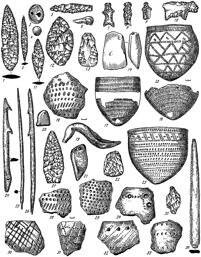 1, 2, 5, 7-13, 22, 27, 35, 36 – кремень; 3, 4, 20, 21 – янтарь; 14 – сланец; 15–18, 23, 28–34 – керамика; 19 – дерево; 24–26, 37 – кость.