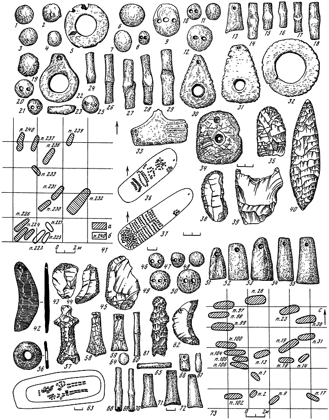 1-34, 46–55, 64–72 – янтарь; 35, 38–40, 43–45, 57, 61, 62 – кремень; 42, 56 – сланец.