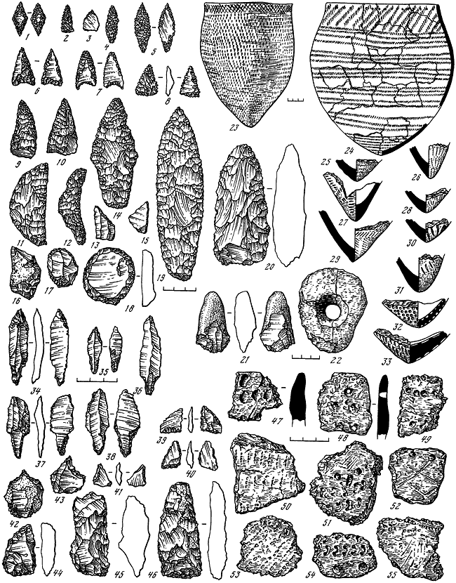 В настоящее время ранненеолитический слой выделяется только на стоянке Репище, где он залегает в основании культурного слоя в торфяниковой части стоянки. К раннему неолиту относится толстостенная керамика с примесью песка, толченой раковины или органики. Форма сосудов полуяйцевидная, дно острое, но не оттянутое как в валдайской ранненеолитической культуре, венчики прямые, часто суженные. На внутренней стороне встречаются следы от заглаживания штампом. Посуда орнаментирована только в верхней части узорами из мелкозубой гребенки, прочерченных линий, наколов, ямок округлой или треугольной формы. Кроме горизонтальных рядов косо поставленных отпечатков гребенчатого штампа, зигзагов или косой сетки, встречаются диагональные полосы из ямок и оттиски крупноячеистой рыболовной сети. На некоторых сосудах бывают сквозные отверстия для подвешивания или починки (рис. 63). Орудия выполнены из темно-серого кремня. Среди них топоры, скребки прямоугольной, подтреугольной или трапециевидной формы. В числе костяных орудий (рис. 63) мелкозубчатое одностороннее острие, биконический наконечник стрелы с уплощенным насадом и др. Аналогичные находки имеются на Бологовской стоянке, а также на ранненеолитических стоянках Ивановское IV (Крайнов, 1977), Кяэпа (Янитс, 1973). Описанный комплекс раннего неолита может быть сопоставлен с другими культурами лесной полосы – верхневолжской, нарвской. Хронология раннего неолита рассматриваемого региона не определена.