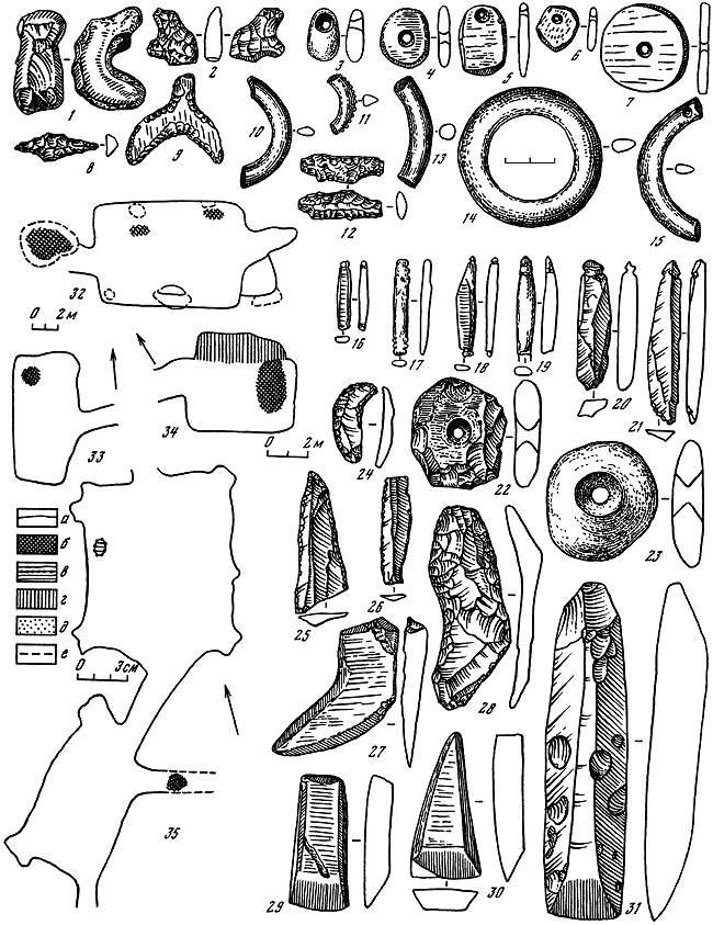 1, 2, 8, 9, 12 – мелкая пластика из глины (1) и кремня; 3–5, 10, 11, 13–15 – подвески и кольца из сланца; 16–21 – составные части рыболовных крючков; 22, 23 – грузики; 24–28 – ножи из сланца и кремня; 29–30 – тесла и топор; 32–35 – жилища (Кудома X – 32; Вигайнаволок I – 33, 35; Лахта II – 34).
