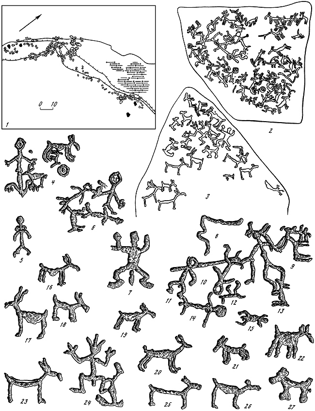 1 – расположение камней с рисунками на местности; 2 – камень № 5; 3 – камень № 9; 4-27 – изображения на камнях.