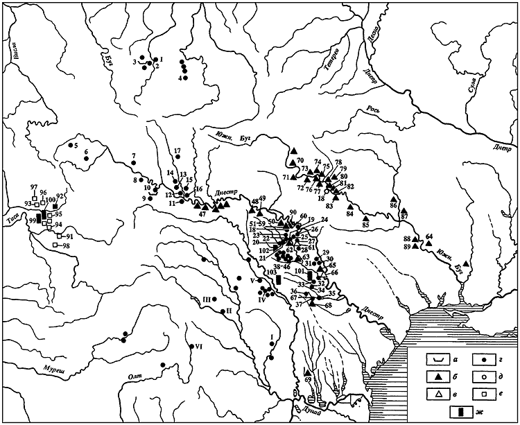 Памятники буго-днестровской культуры: 47 – Перебыковцы; 48 – Наславча I; 49 – Каларашовка I; 50 – Косоуцы III; 51–59 – Сороки I–IX; 60 – Трифауцы V; 61 – Цыра II; 62 – Стрычены I; 63 – Саратены I; 64 – Константиновка-Пугач; 65, 66 – Голерканы I, VII; 67 – Русешты Новые I; 68 – Ханска V; 69 – Гаванос I; 70 – Клищев; 71 – Печера; 72 – Глинское; 73 – Коржив; 74 – Самчинцы; 75 – Сокольцы I, II, VI; 76 – Шимановское; 77 – Заньковцы; 78 – Жакчик; 79 – Мельничная Круча; 80 – Скибинцы; 81, 82 – острова Базьков и Митьков; 83 – Чернятка; 84 – Гайворон-Положок; 85 – Саврань; 86 – Владимировка; 87 – Миколина Брояка; 88 – Гард; 89 – Прибугское (Ак-Мечетка); 90 – Дикиновка.