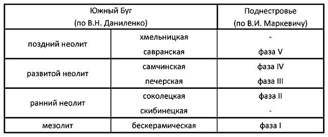 Буго-днестровская культура известна в основном по материалам поселений. Исходя из стратиграфических наблюдений на многослойных поселениях, В.Н. Даниленко предложил деление буго-днестровской культуры на шесть фаз: скибинецкую, соколецкую (ранний неолит), печерскую, самчинскую (развитой неолит), Савранскую, Хмельницкую (поздний неолит). После раскопок стоянок Сороки I и II на Днестре В.И. Маркевич выделил пять фаз, первая из которых относится к бескерамическому неолиту, согласно нашей терминологии, мезолиту. Соотношение двух периодизаций выглядит так: