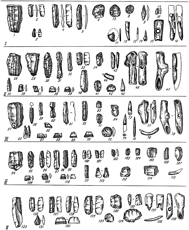 Рис. 1. Орудия буго-днестровской культуры. Фазы: I – скибинецкая, II – соколецкая, III – печерская, IV – самчинская, V – савранская.