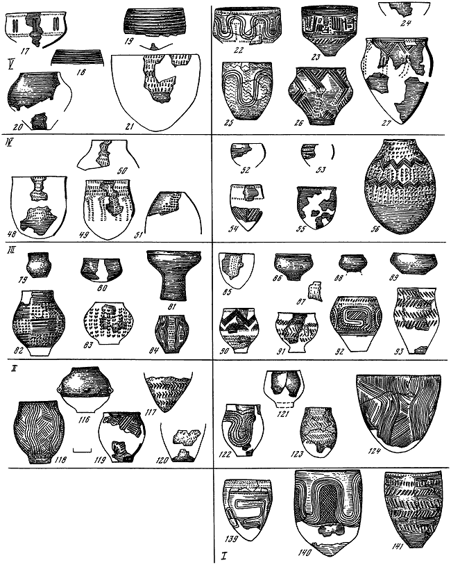 17, 18 – Цикиновка; 19–21 – Сороки V; 22 – Владимировка; 23 – Базьков остров; 24, 25 – Миколина Брояка; 26, 27 – Саврань; 48–51 – Сороки I, слой 1а; 52, 53 – Базьков остров; 54, 56 – Самчинцы; 55 – Глинский; 79–81 – Селиште I; 80, 83 – Сороки I, слой 1б; 82, 84 – Сороки III; 85, 87–89, 91–93 – Сокольцы VI; 86 – Глинское; 90 – Заньковцы II; 92 – Сокольцы I; 116–120 – Сороки II, слой 1; 121–124 – Сокольцы II; 139 – Митьков остров; 140–141 – Базьков остров.